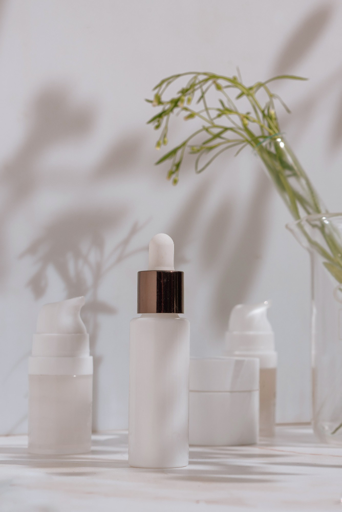 Biała, matowa butelka z serum z kroplomierzem, prezentowana na tle białego jedwabiu. Butelka o prostym, nowoczesnym designie z subtelnymi liniami i kształtem, podkreślającym wysoką jakość i elegancję. Kroplomierz wykonany z przezroczystego szkła i metalu, dodający funkcjonalności i ułatwiający precyzyjne dozowanie. Tło z białego jedwabiu, podkreślające czystość i luksusowy charakter produktu, dodające delikatności i subtelności kompozycji. Miękkie, rozproszone światło akcentujące gładkość i jedwabistość tkaniny, jednocześnie skupiające uwagę na butelce, wydobywając jej matową elegancję i czystą estetykę.