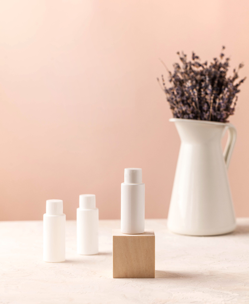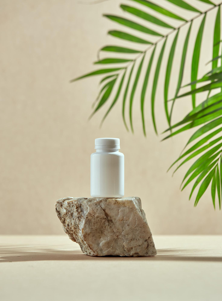Zestaw męskich produktów do pielęgnacji, zawierający ciemnobrązową butelkę z dyspenserem oraz eleganckie akcesoria. Butelka, wykonana z wysokiej jakości materiałów, z wyraźnymi liniami i męskim designem, wyposażona w wygodny dyspenser ułatwiający dozowanie. Akcesoria, takie jak eleganckie pędzle do golenia czy maszynki, wykonane z metalu i drewna, prezentujące się stylowo i funkcjonalnie. Ustawienie zestawu obok naturalnego kamienia, podkreślające surowy, męski charakter serii. Kompozycja, która łączy w sobie elegancję i praktyczność, idealna dla mężczyzn ceniących zarówno jakość, jak i estetykę w codziennej pielęgnacji.